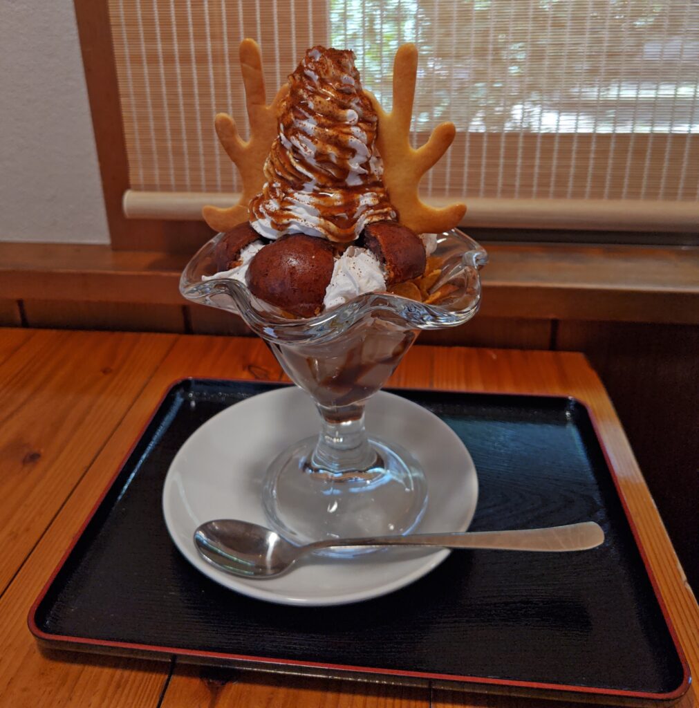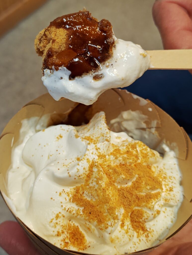 上は生クリーム、その下にバニラアイスが入っており、1番下が寒天でした。周りに八丁味噌のかりんとう饅頭が乗っています。これがまた、ここだけ温かくて…︎︎いい👍