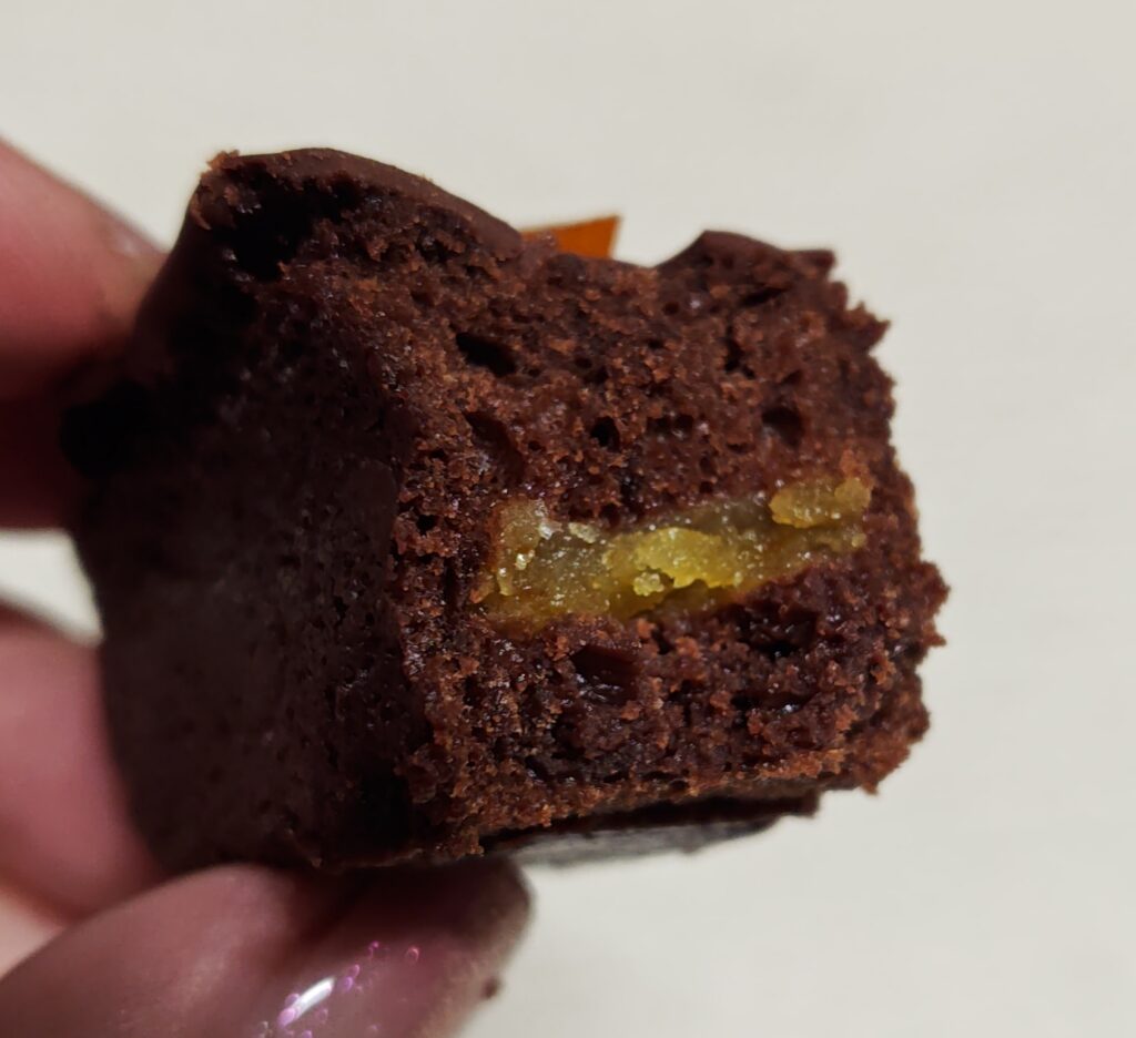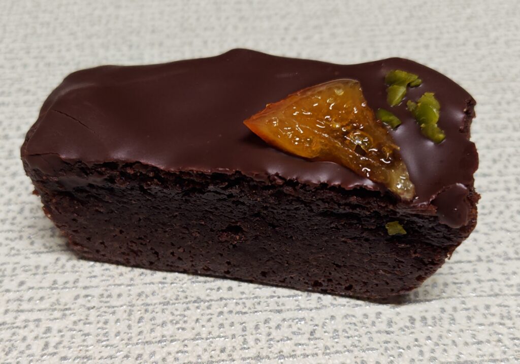 ブラウニーに近いような濃厚なショコラ生地は、やや苦味もある大人な味わいです。そこにオレンジのコンフィが加わることで、爽やかな酸味がプラスされて甘すぎない絶妙なバランスに。全体を包むショコラコーティングもしっかりしていて、チョコレート好きにはたまらない贅沢感があります。