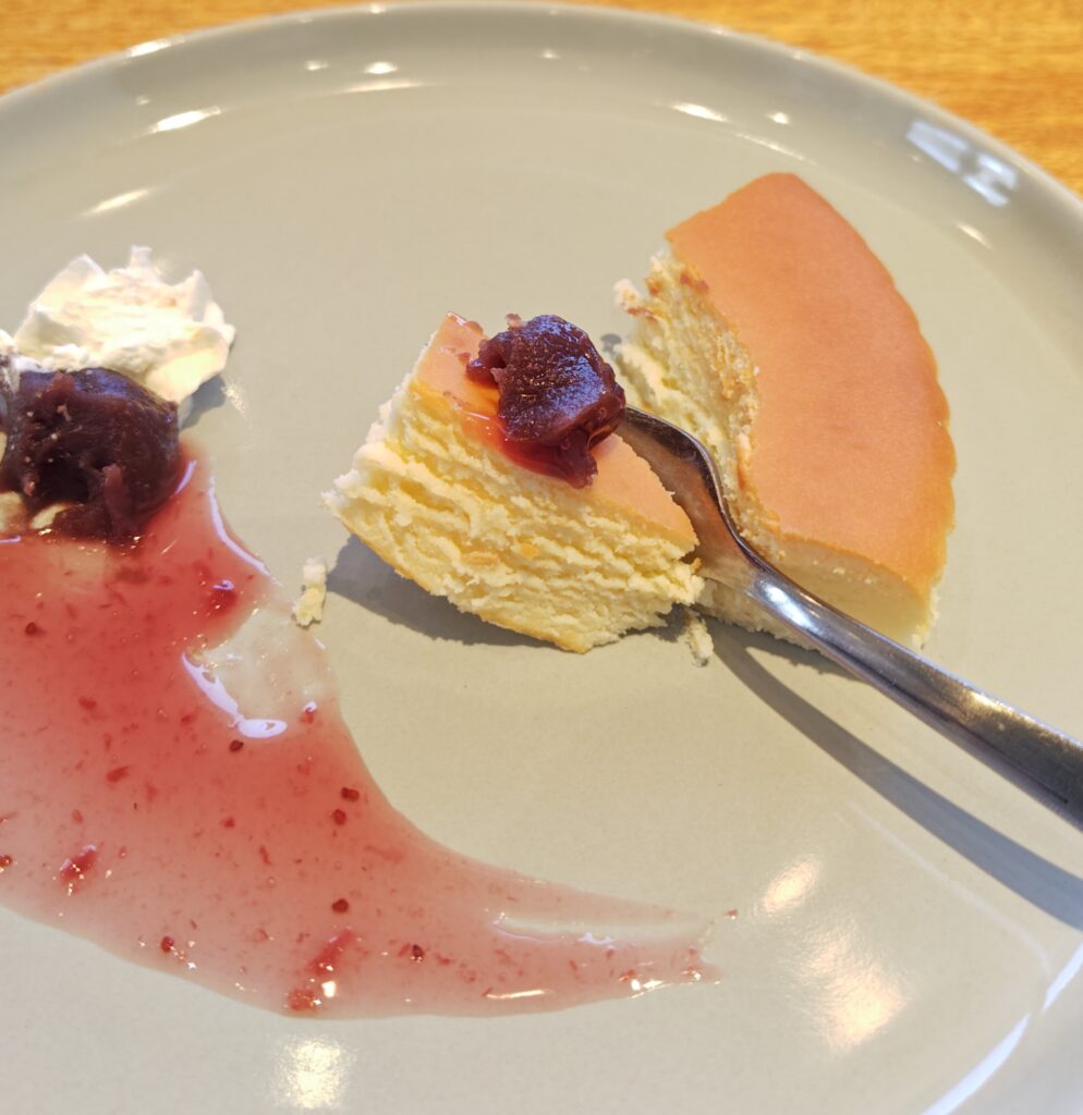一口食べるとチーズの味がとても濃くて、しっとりとした食感です。もちろんチーズケーキ単体でも十分すぎるくらい美味しいのですが、添えられている餡と生クリームを一緒に食べると甘さのバランスがちょうどよくて、和と洋の組み合わせがすごく合っていました。