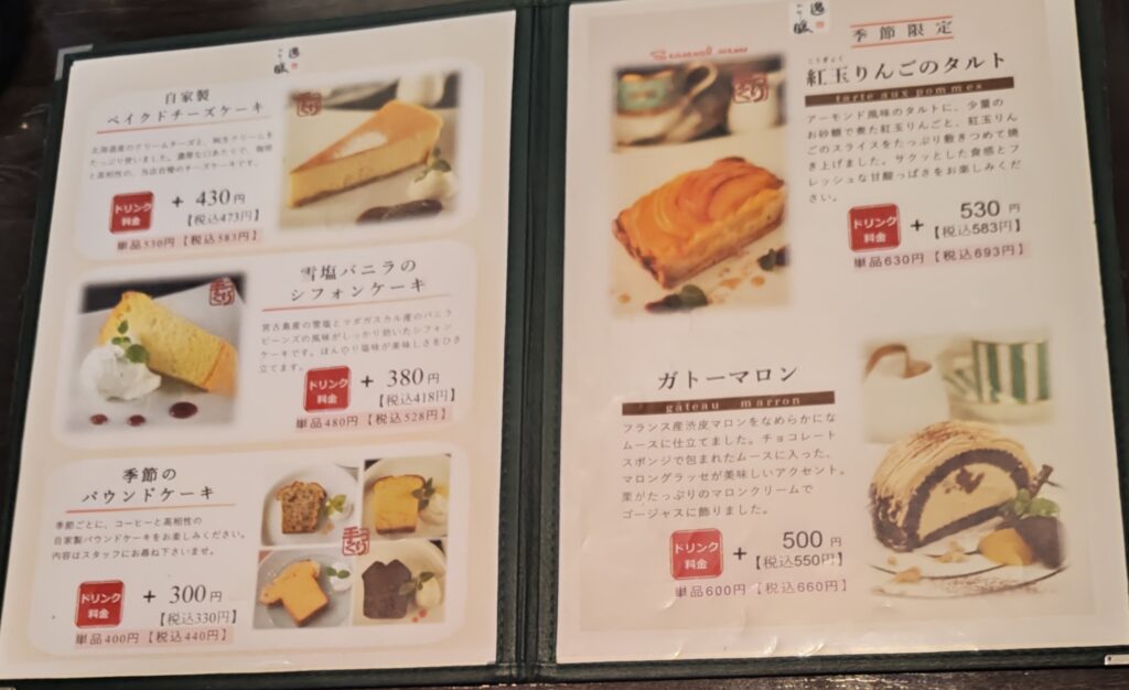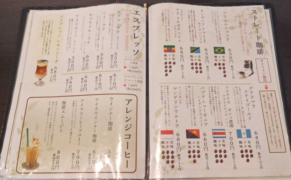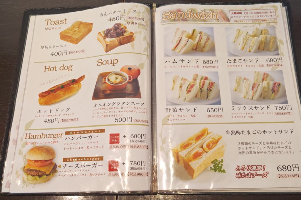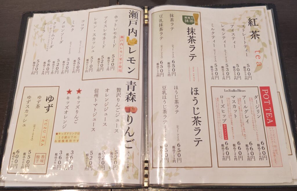 サイフォン抽出のコーヒーや、キャンドルウォーマーで提供される紅茶など、ドリンクにもこだわりが感じられます。フードメニューも種類が豊富で、軽食からスイーツまで幅広く揃っていました。