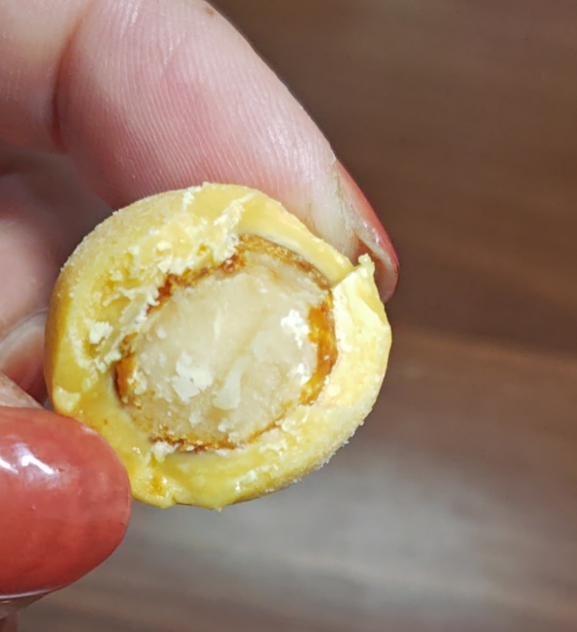 すると、こだわりのチーズチョコレートの中から、メープルシュガーでコーティングされたマカダミアナッツがゴロッと登場!このナッツの「甘じょっぱさ」がたまらないです。