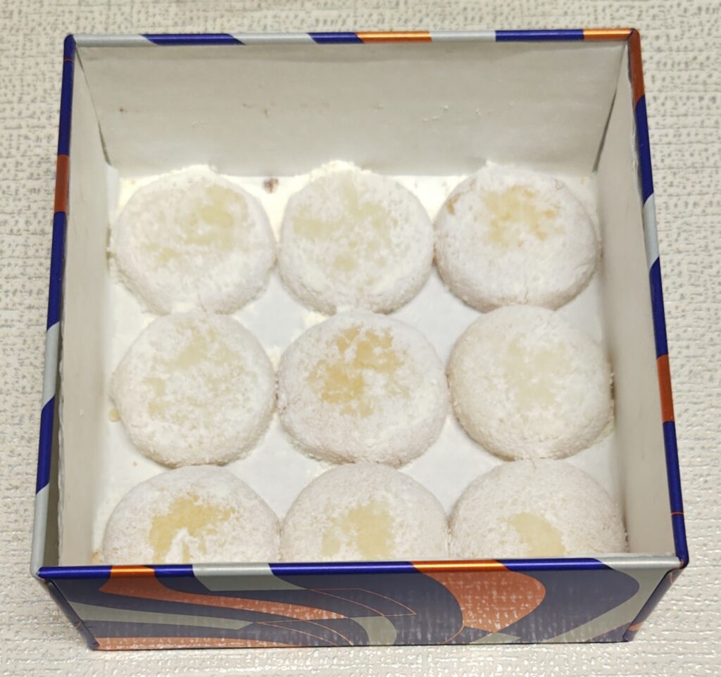 今回、これが一番感動しました!口に入れた瞬間はサクサク、ほろほろっとした食感なのに、その直後にシュッと儚く溶けて消えていくんです。ブールドネージュ特有の強すぎる甘さがなく、とても上品な味わいで、思わず手が止まらなくなる美味しさでした!