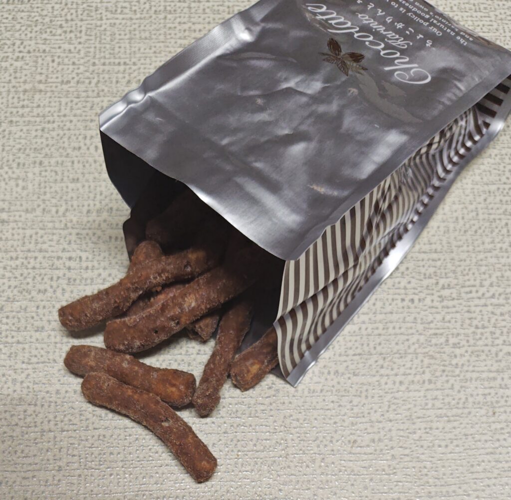なめらかな口当たりのチョコレートが、生地の中までしっかりと染み込んでいる贅沢な仕上がりです。チョコがたっぷり染みているのに、ベースがかりんとうなので特有のサクッとした軽快な食感はちゃんと残っていて、生地の香ばしさとチョコの甘さが相性抜群です。美味しすぎて手が止まらず、ちょっと量が少なめなこともあって一瞬でペロッと食べきってしまいました。