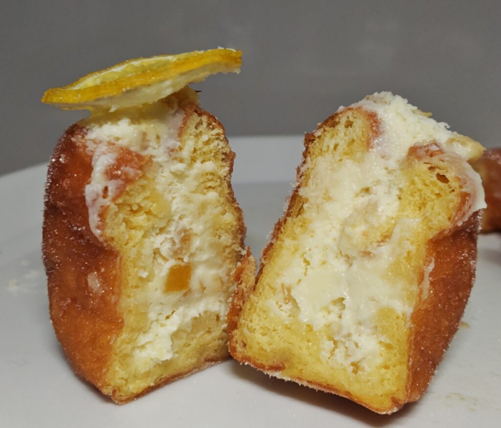 大きめのレモンピールが入っていて結構主張しているタイプ。まわりの砂糖は多めで甘いですが、生地はふんわりとしていて、生ドーナツだからなのか油っぽさは全くありませんでした。