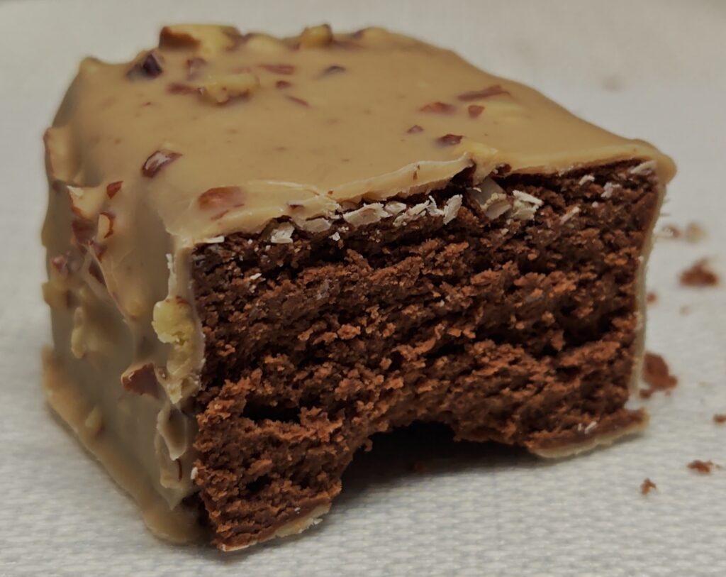 ピーカンナッツが入ったチョコレートがかかっていて、このナッツが食感のアクセントになっています。
