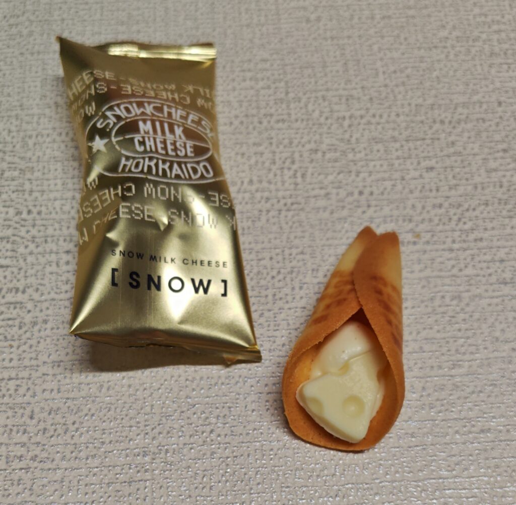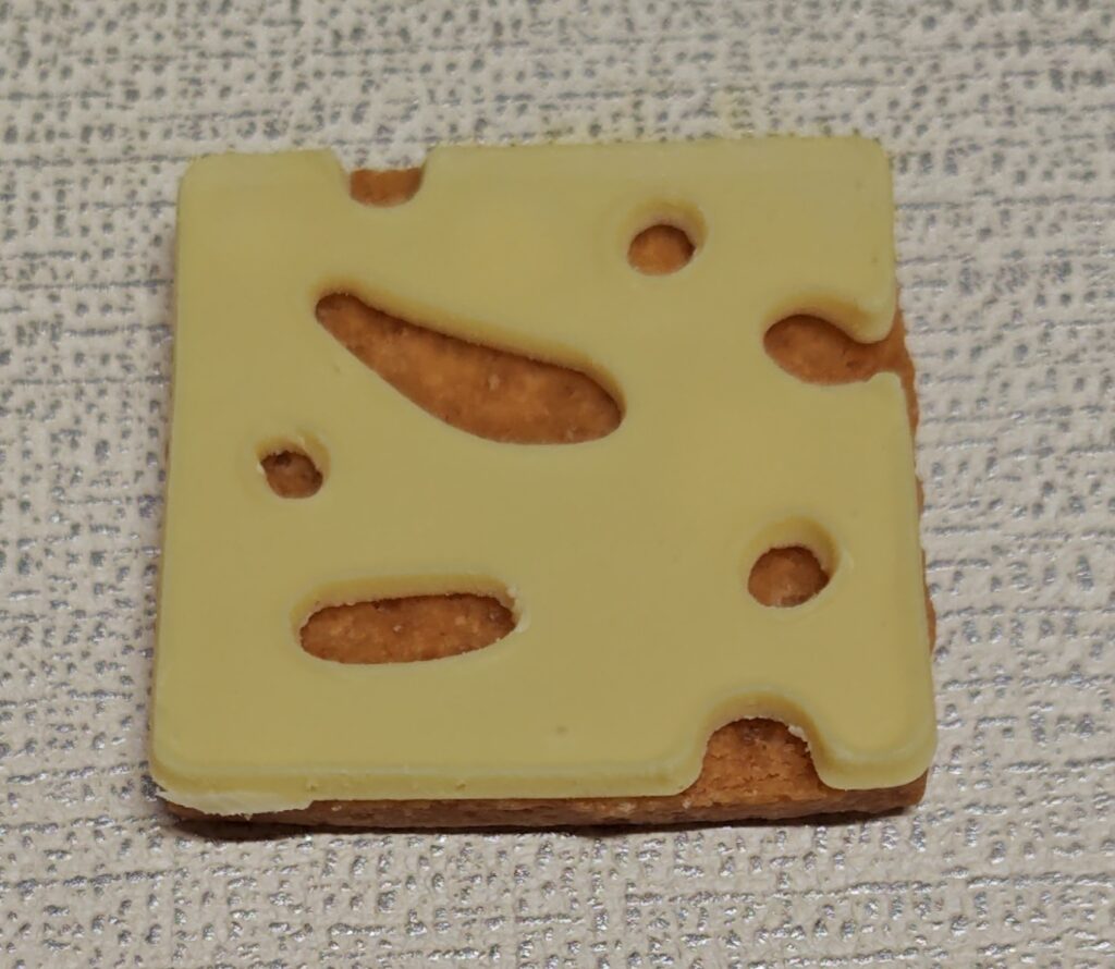 チーズ味のラングドシャ生地に、ホワイトチョコクリームとチーズのチョコレートを合わせたお菓子。