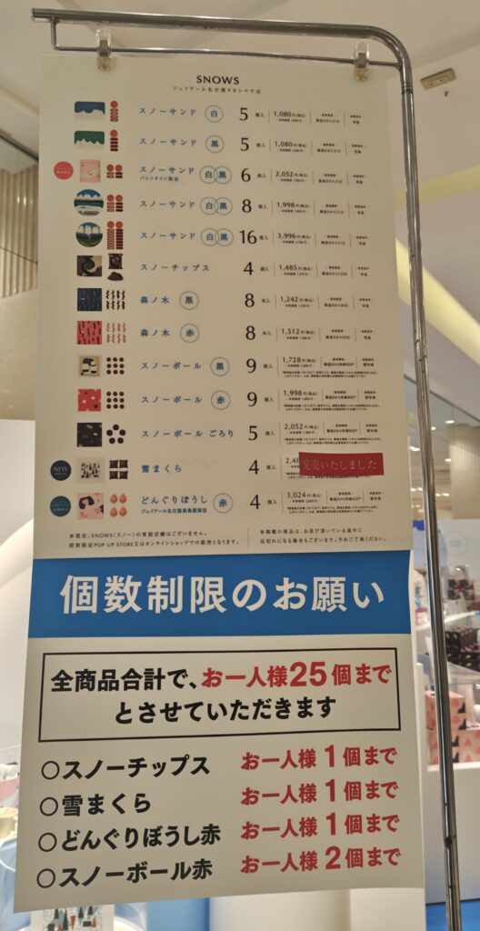 スノーチップスのみ、LINEのお友達登録をされている方、その場で登録された方はレジにて画面を見せると2箱まで購入可能と案内がありました。