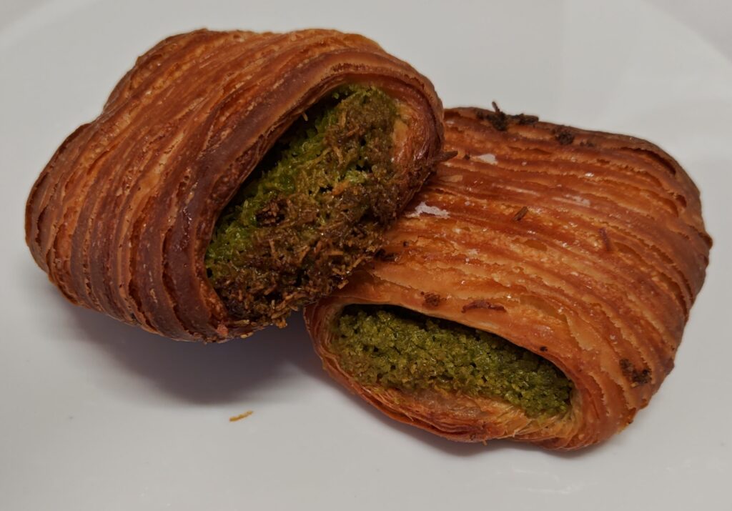 そして一口かじるごとに、ピスタチオの芳醇な香りがスッと鼻に抜けていきます。ドバイチョコ系は甘さが強いものも多い中、こちらは全体的に甘すぎず、ピスタチオの風味とクロワッサンの香ばしさを生かした絶妙なバランスでまとまっています。