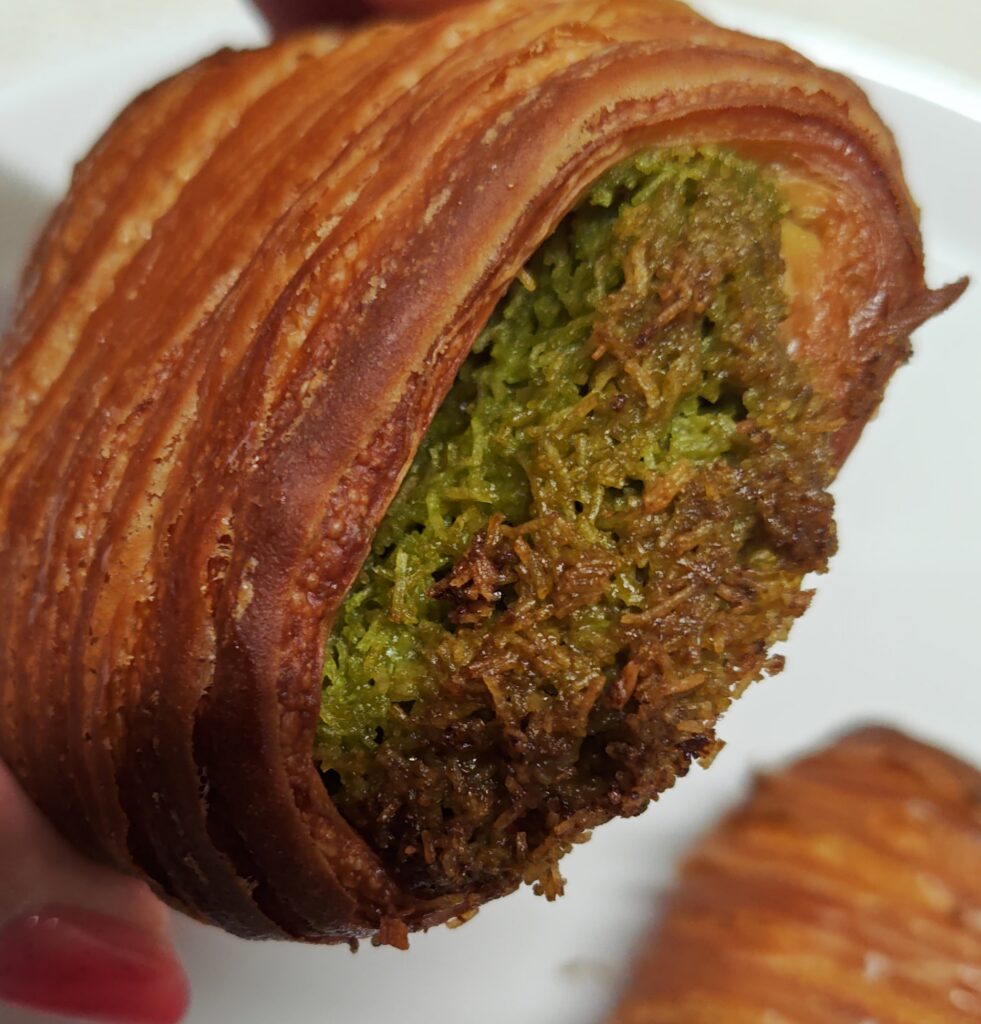 いざ実食してみると、まず印象的なのは食感です。外側のクロワッサン生地のサクサク感に、中に入っているカダイフのサクサク感が重なり合って、まさにサクサク×サクサクのハーモニーが口に広がります。