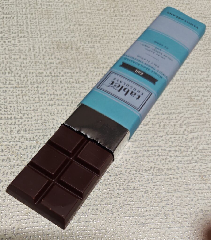 ​塩気がしっかり効いている分、ベースとなっているチョコレートはダークチョコレートが使われているのが嬉しいポイント。カカオの深みとビターな風味が塩のアクセントと見事に調和していて、甘すぎず、次から次へと食べ進めてしまう美味しさです。甘いものがそこまで得意ではない方にもおすすめできる、大人のタブレットショコラだと思います。