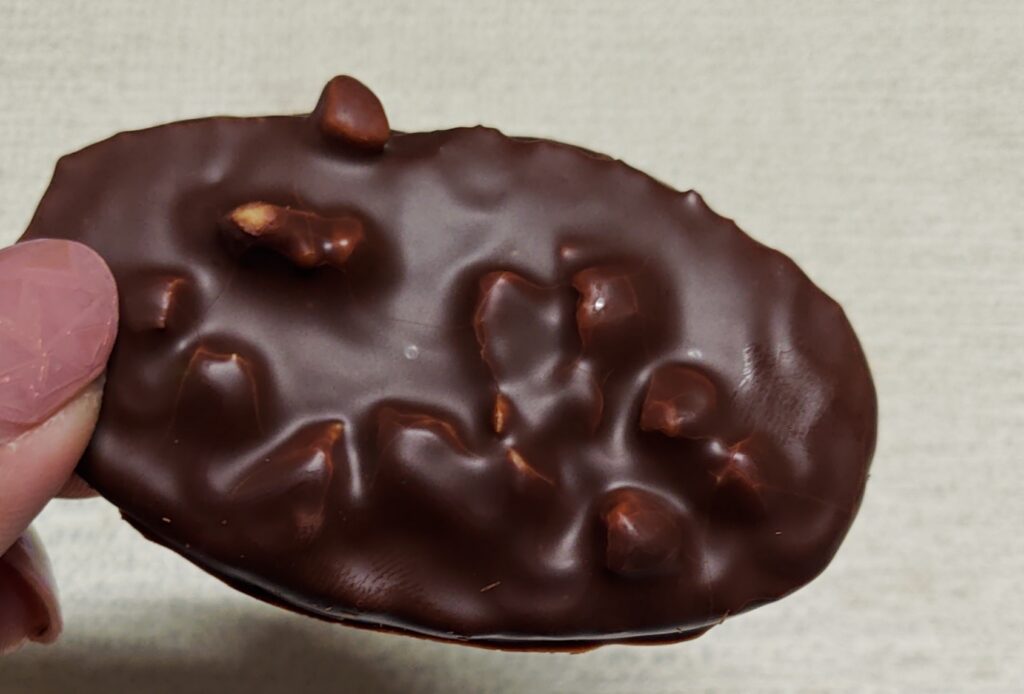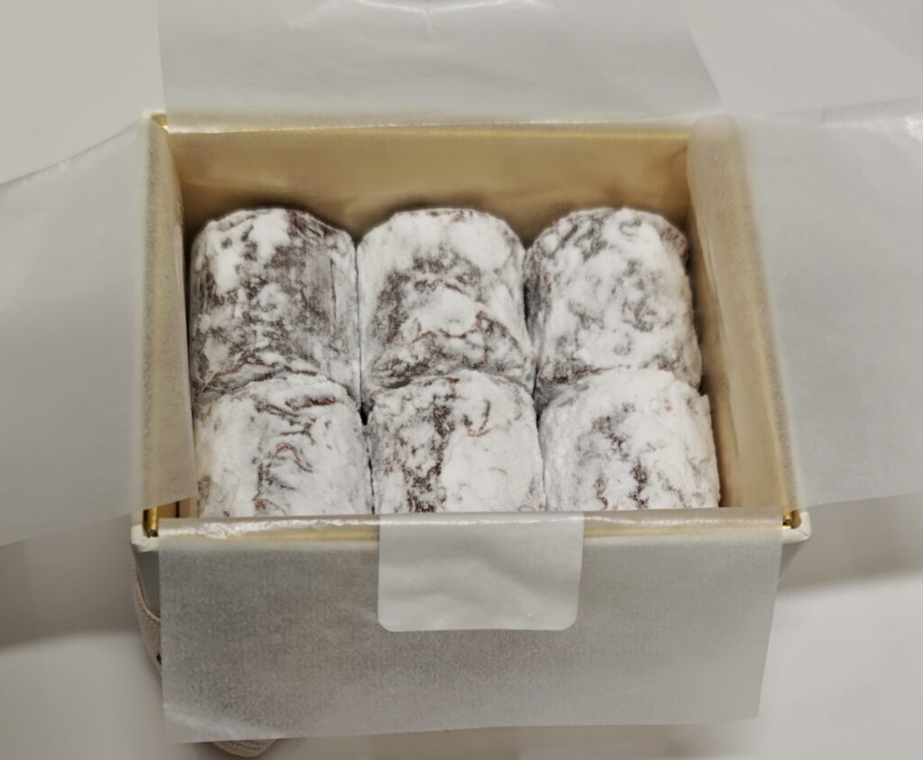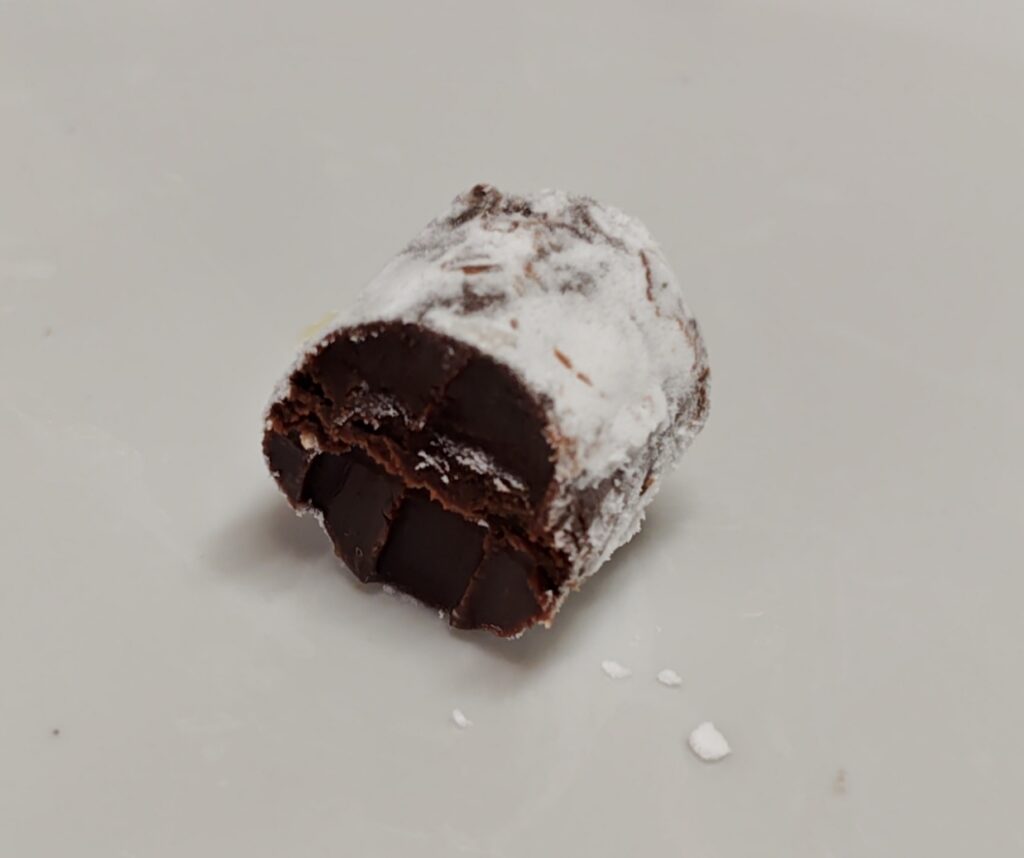 まず表面の粉糖のシャリシャリとした食感が面白く、その後のチョコレートとのバランスが取れています。